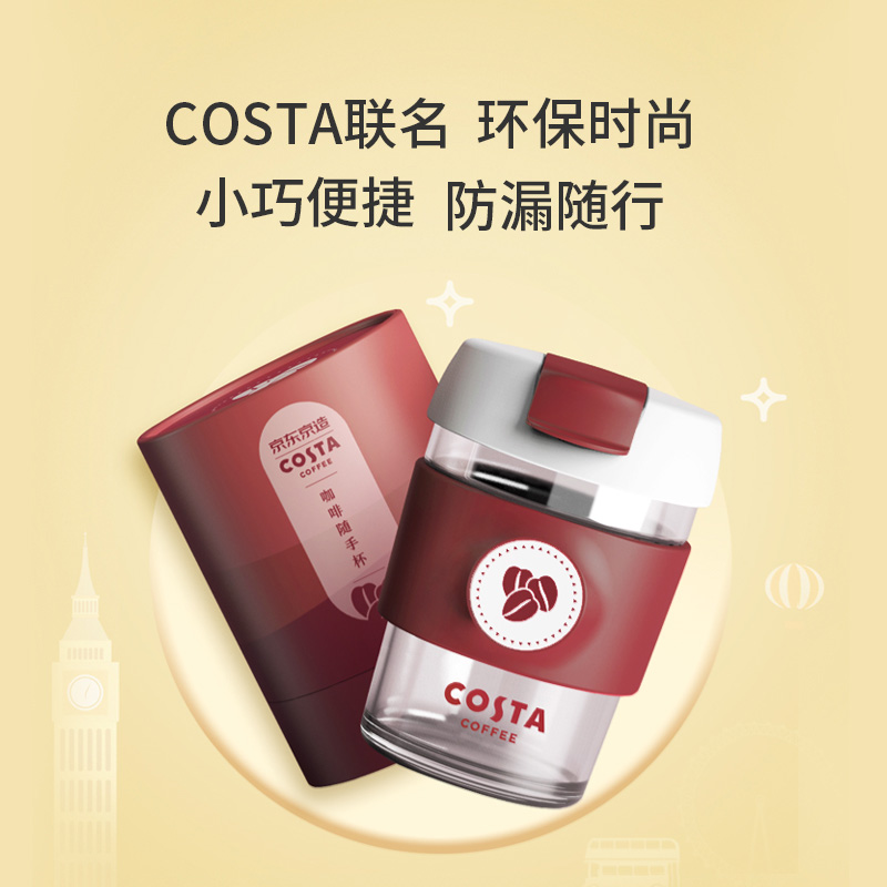 京东京造 X COSTA COFFEE 联名款随手咖啡杯,使用精致的木槿紫色搭配COSTA与京东京造的logo,整体设计时尚有型,杯体材质采用不含铅的高硼硅玻璃,可以承受-20℃~150℃的温度,周身使用罗马柱纹理的防烫硅胶套,握感舒适不烫手,不易爆裂,耐酸耐碱性能稳定。杯盖内部采用食品级接触封水圈和封水塞,可以全方位防漏,杯盖外部使用了磨砂处理,细腻耐摩擦,放入包包也能安心出行。除此之外,盖口还设有三角形饮口,掀开杯盖即可直饮,非常方便。杯子全身可拆洗,易清洁,杯身容量为365ml,重量为245g。为了保护环境减少使用纸杯数量,请带上随行杯,一起为环保助力。