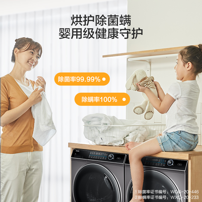 海尔XQG100-BD14176LU1洗衣机具有双擎热泵,净洗比1.10,直径为595mm,洗脱容量10kg,洗烘WIFI联动,更方便,具有独立风机和滚筒电机,能实现1:1正反转,使衣服舒展防止缠绕,独立风机根据衣服来变速,直驱电机,力道大传送效率好,采用水溶性紫外线,拒绝直射伤衣,迅速破坏水中细菌的,DNA分子结构,除菌抑菌净除螨虫,洗衣时对衣物进行智能检测。更具有微蒸汽空气洗,清洗多种衣服类型精控洗衣液、 柔顺剂投放量,更省更精准,具有四重线屑过虑,轻松除出毛屑,具有高标准的羊毛洗涤模式。