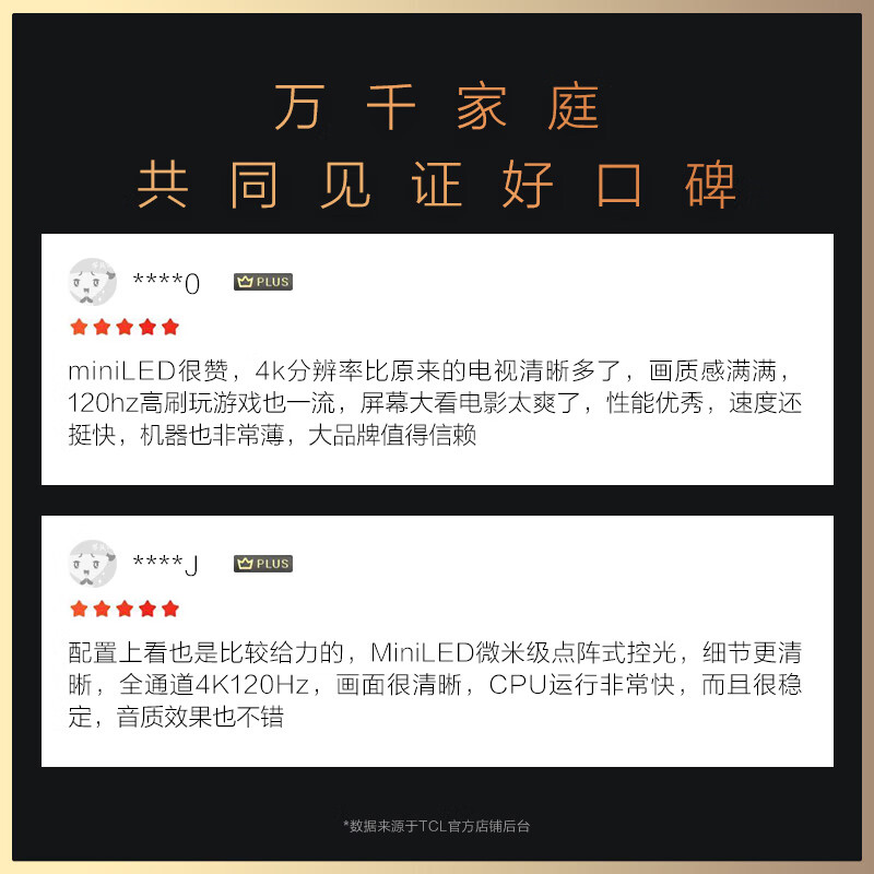 TCL Q10G系列 液晶电视,采用Mini LED背光技术,微米级精细控光。85英寸有448个分区、75英寸有360个分区、65英寸有288个分区,55英寸有240个分区。98% DCI-P3高色域,大幅度提升了色域空间,精准展现10.7亿色彩,呈现更多的层次细节。专业色彩矫正ΔE≈0.99,真实还原自然色彩。支持Dolby Vision IQ、Dolby Vision、HDR10、HDR10+、HDR HLG,全生态HDR认证。全功能HDMI 2.1接口,支持全通道4K 120Hz超高清 真高刷(120Hz MEMC+120Hz VRR+ALLM,120Hz fps HDMI2.1,120Hz BFI无残影背光)。配备了全新领曜芯片 M1,搭载4核 A73 CPU、双核G52 GPU,4GB内存+64GB闪存组合,助力3D电影原彩以及像素重构,确保画面清晰,颜色精准,层次丰富,运动流畅。支持Dolby Atmos 杜比全景声,清晰透彻,配合昂贵的Conex弹波材质,波线性更好,不失真以及稀土钕铁硼强磁,提供强劲动力、声音更响亮,全新纳米级吸音棉,排除其他干扰,还原真实声音。