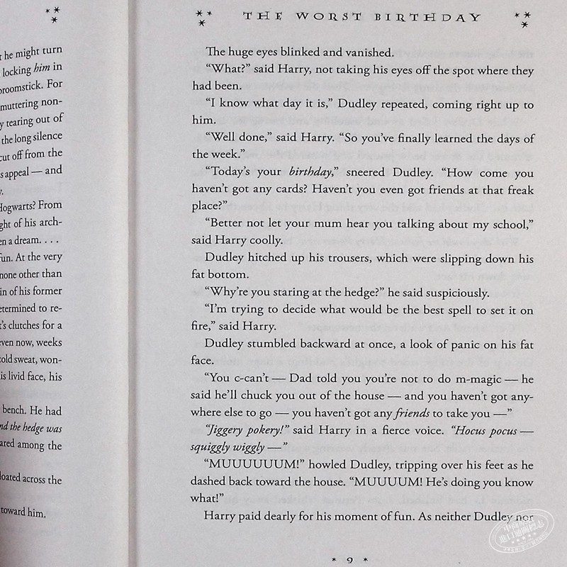 《哈利·波特》是英国女作家J.K.罗琳创作的系列小说,共7部。《哈利波特》共被译成近七十多种语言,在两百多个国家累计销量达三亿五千万多册,位列史上非宗教、市场销售类图书首位。整套书遣词通俗易懂,剧情引人入胜,是寓教于乐的好读物,非常适合儿童提高英语阅读能力。《哈利波特》英文原版共有四个版 本:美国精装版、美国平装版、英国平装(成人封面)版、英国平装(儿童封面)版,这里推荐的是美国平装版。