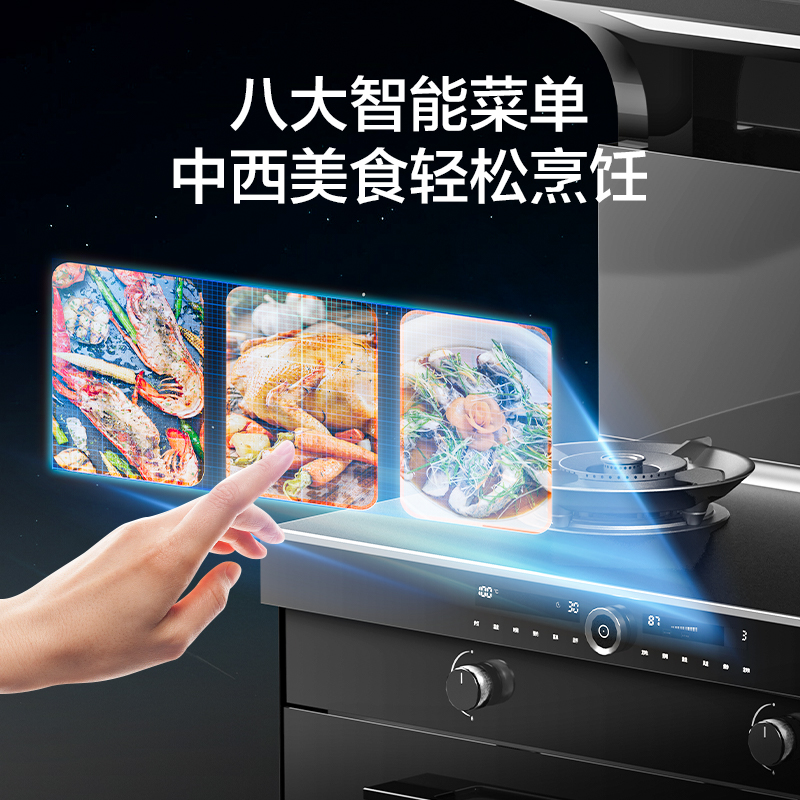 这款京造集成灶,采用变频直流电机,噪音低至56分贝,吸力20m3/min,最大静压值800Pa,可应对爆炒等情况,同时具有电热自清洁功能,配备纯铜炉头,支持烟灶联动,火力为5.2kW,左右可分别独立定时关火,面板采用了罕见的磨砂玻璃材质,防刮防指纹,使用更美观。下方集成一部蒸烤箱,内胆使用304不锈钢材质,一体拉伸成型,无卫生死角,经久耐用,30℃~230℃广域控温,三面热管,具有自清洁、解冻、热风等8种实用功能。
