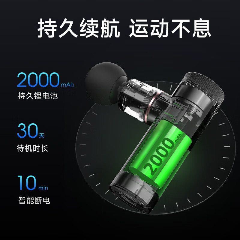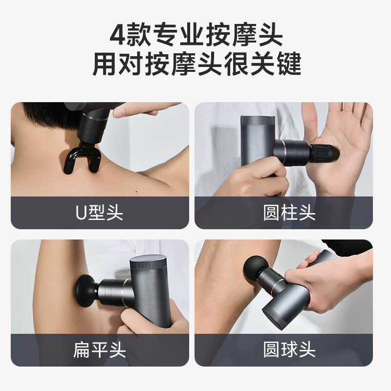4档变速刚柔并济照顾身体每一处部位,满足日常放松的不同需求。全硅胶按摩头真人体验触感对比传统泡沫按摩头,升级全硅胶材质,加料不加价按摩放松更彻底。亲肤全硅胶按摩头真材实料好物用心造直接和人体接触部分均为全硅胶材质,按摩放松不再生硬,每一处击打都恰到好处,柔软且舒适。4种标准按摩头满足日常按摩需求缓解疲劳,生活好伴侣。同样的品质超预期的性价比低档位运行,8小时持续续航,180天待机,每次使用时长建议10-15分钟,续航能力30天。min机身轻巧便携便于出行随时按摩可放口袋,方便快捷