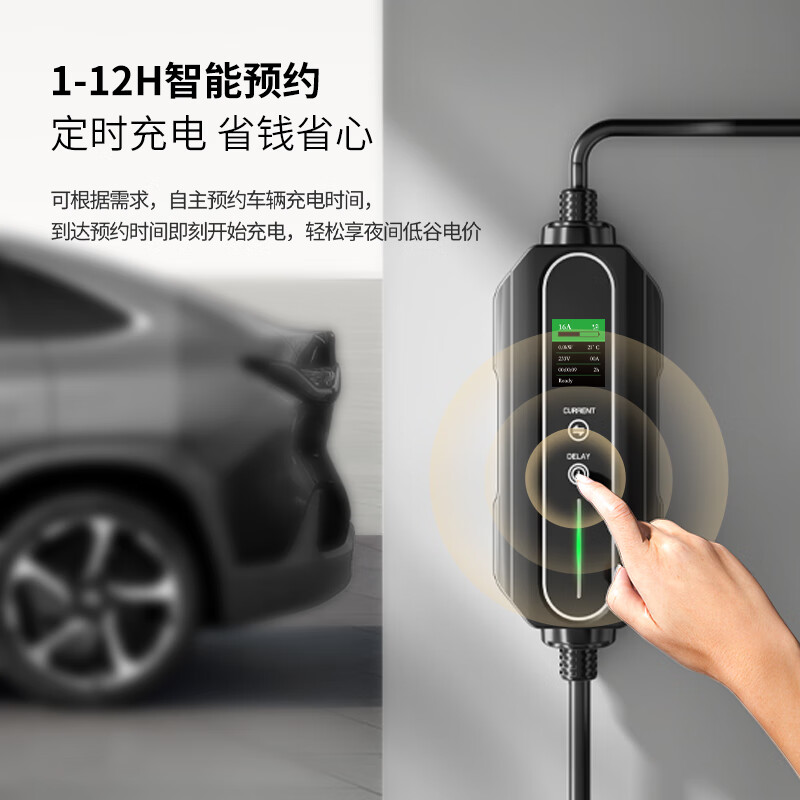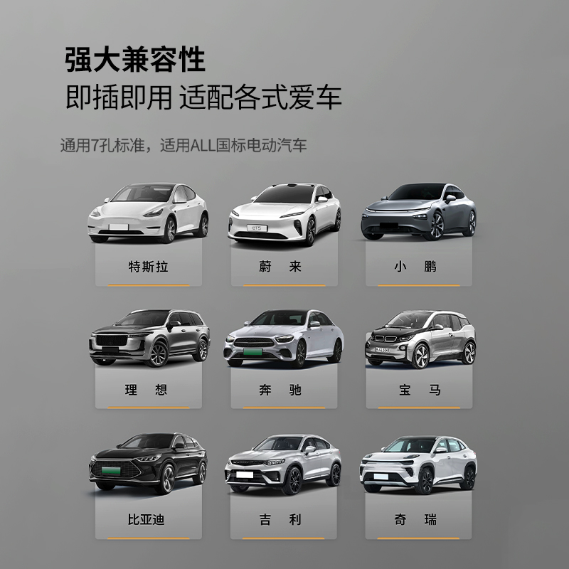 强大兼容性,即插即用,适配各式爱车,通用七孔标准,适用99%国标电动汽车。有插座的地方就能安全充电,居家旅行必备。液晶显示大屏。电压和电流充电功率,时间,状态,温度等均可直观呈现。充电实时状况一目了然。自选充电模式,快慢随意切换。1至12小时智能预约定时充电