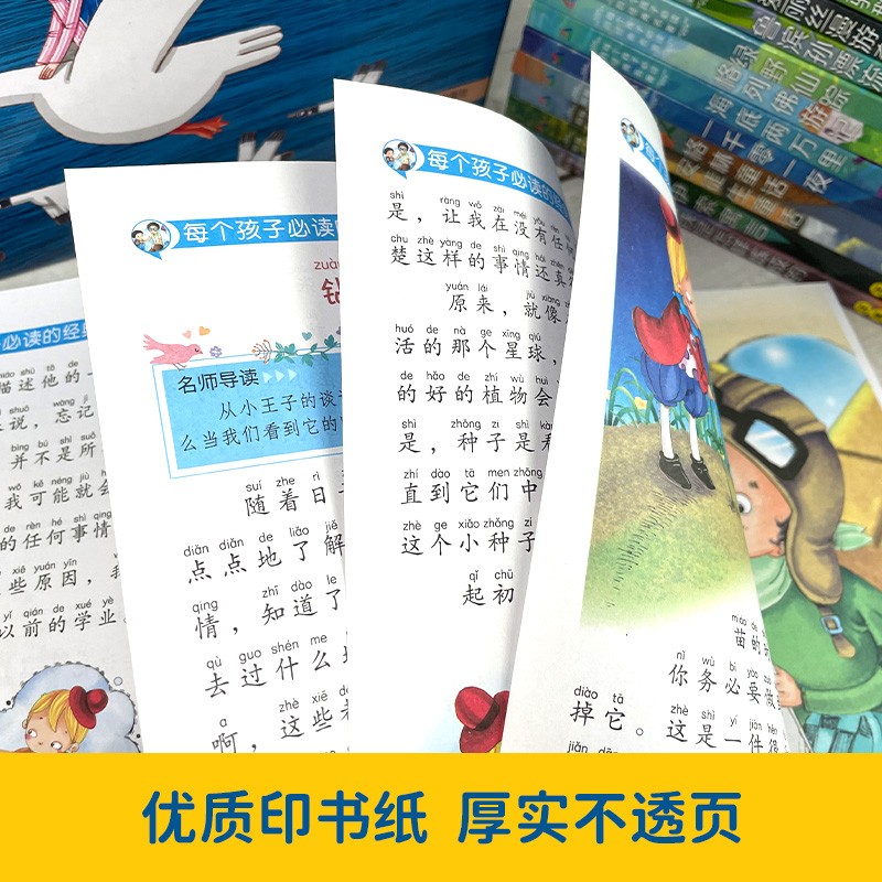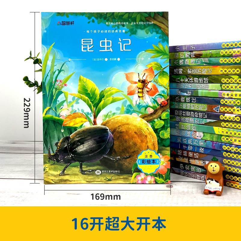 本书共20册,包括《尼尔斯骑鹅历险记》《昆虫记》《小王子》《鲁宾孙漂流记》《木偶奇遇记》《爱丽丝漫游奇境记》《格列佛游记》《爱的教育》《假如给我三天光明》《汤姆·索菲亚历险记》《童年》《绿野仙踪》《海底两万里》《小鹿斑比》《八十天环游地球》《钢铁是怎样炼成的》《伊索寓言》《一千零一夜》《安徒生童话》《格林童话》。