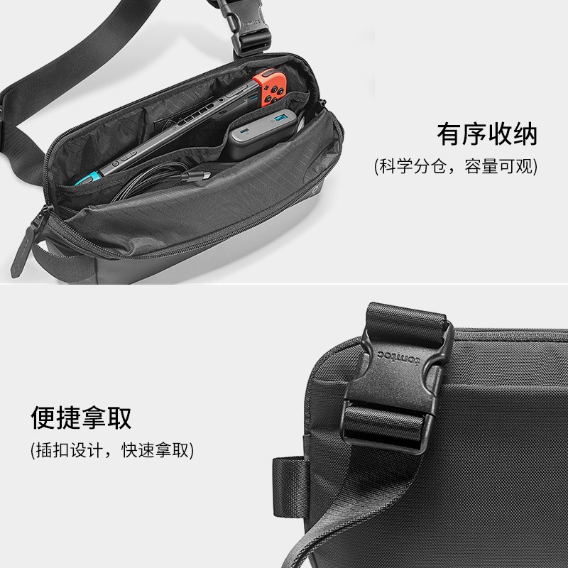 包身采用弹道尼龙材质,具备更卓越的抗撕裂耐磨性能,科学的分仓设计,能很好容纳IPad mini、Switch等硬件设备,并保持一贯优异的安全防护。