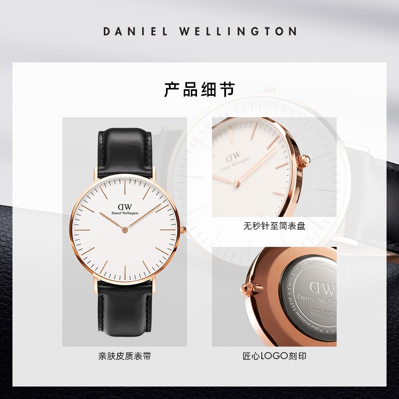 Daniel Wellington丹尼尔•惠灵顿是来自瑞典的腕表品牌,极简超薄的表盘,完美塑造了DW腕表时尚百搭的学院风气质。简约时尚的设计,使它迅速在全球时尚圈走热,并成为时尚达人们必备的潮流单品。