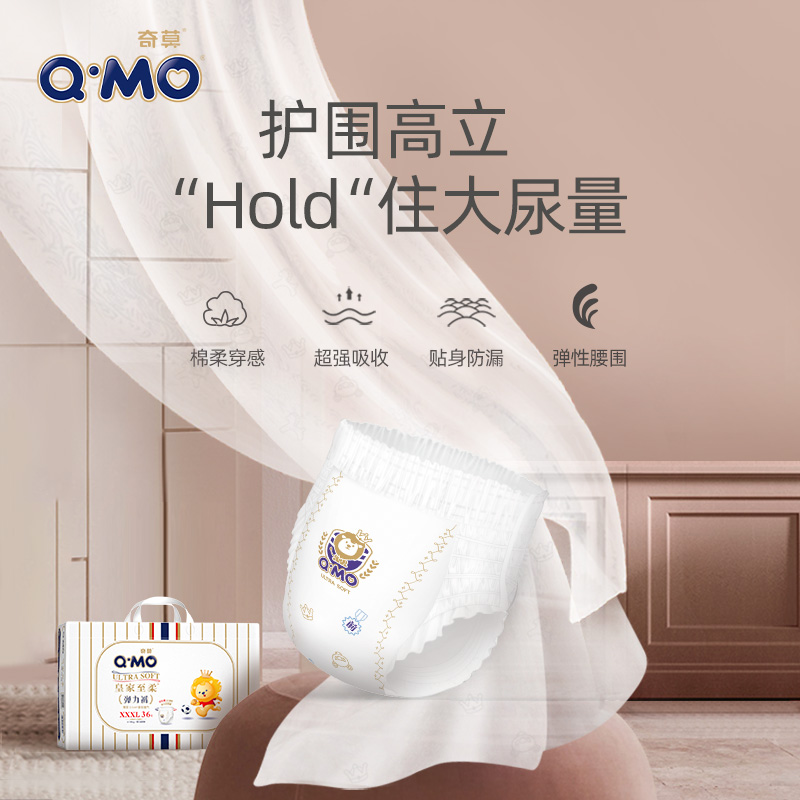 Q·MO 奇莫 皇家至柔 婴儿拉拉裤 XXXL36片,两片式结构,让受力更均匀,减少了束缚与压力,穿着更舒适合身,更人性化的U型高腰围设计,像如影随形的贴身侍卫,加长的尺寸,实现全包覆,让宝宝360度随心所动,和漏尿说拜拜。