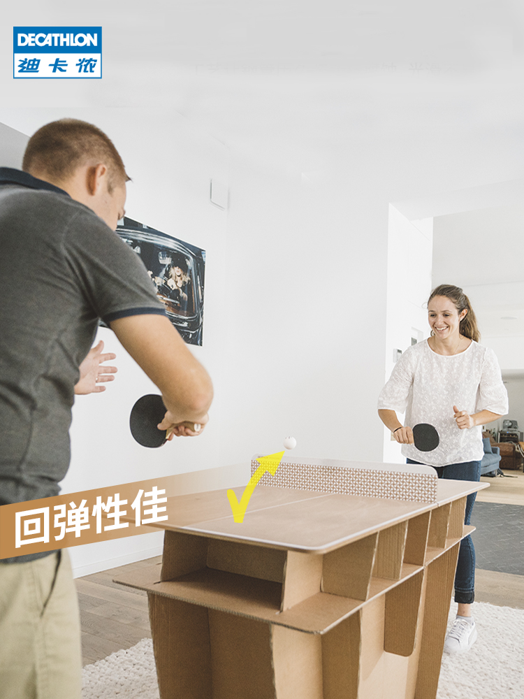 迪卡侬家用乒乓球桌纸桌子 IVE3,圆形桌角安全防撞,8mm厚度的桌面由高密度木材颗粒制成,回弹性佳。桌角和框架的硬度使桌子保持稳定,桌子的中央可以承受250公斤以上的重量。