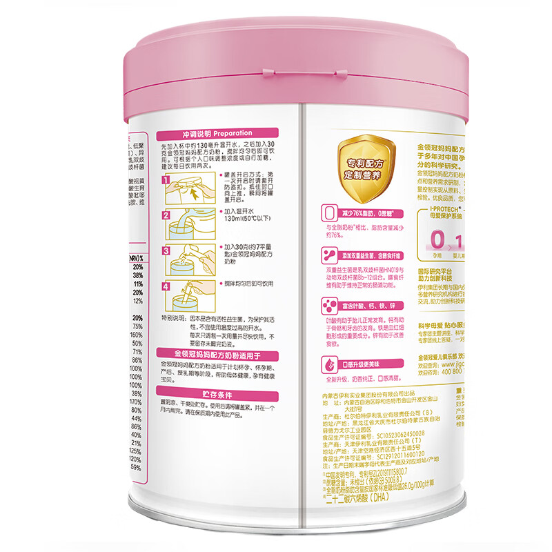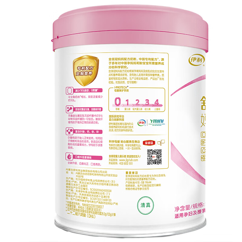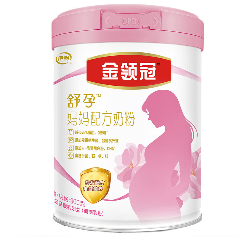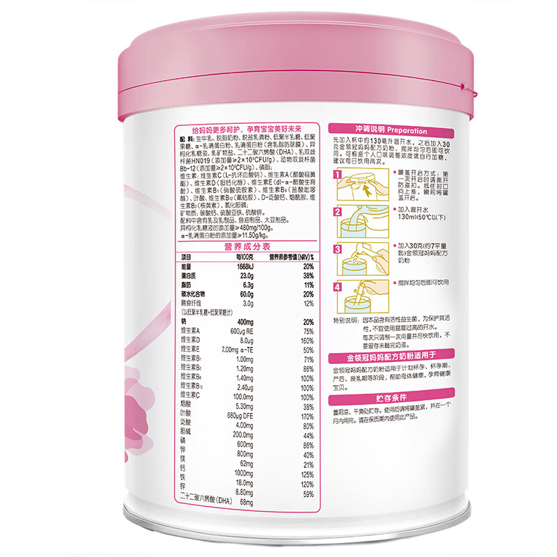 伊利是知名的国产奶粉企业,旗下的奶粉产品线比较丰富,金领冠是其人气和销量都占据前列的品牌,这款金领冠妈妈配方奶粉适用于孕期及哺乳期妈妈,奶粉中含有钙铁锌、胆碱、叶酸等关键营养,能为妈妈提供充足能量,也能促进宝宝的生长发育,添加益生菌组合和GOS/FOS益生元组合,能够调节肠道防止便秘,特别添加α-乳清蛋白粉,能够激发妈妈和宝宝的内在保护力,共同抵御外界病菌侵害,这款奶粉还考虑到了妈妈保持身材的需求,与全脂奶粉相比脂肪含量减少约76%,热量更低,有利于控制体重。