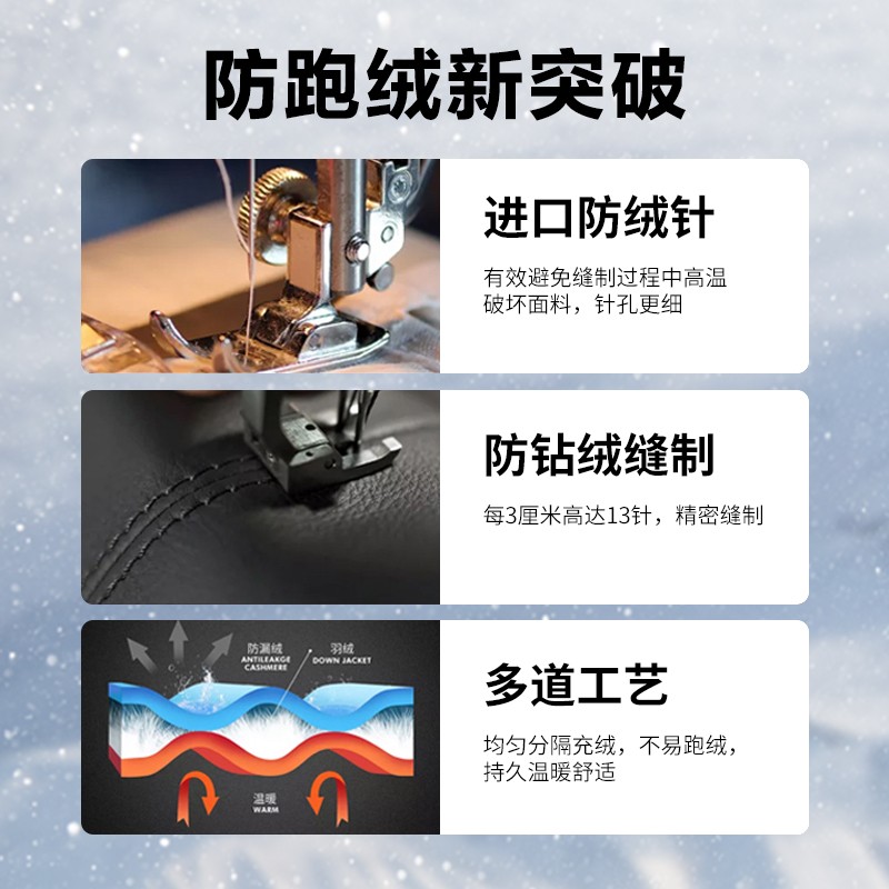 此款采用700蓬白鸭绒,含绒量90%,经DWR防泼水科技技术处理,表面形成拒水层,双面控温技术,保暖锁温,20D防钻绒面料,3D立体剪裁,轻量化设计。