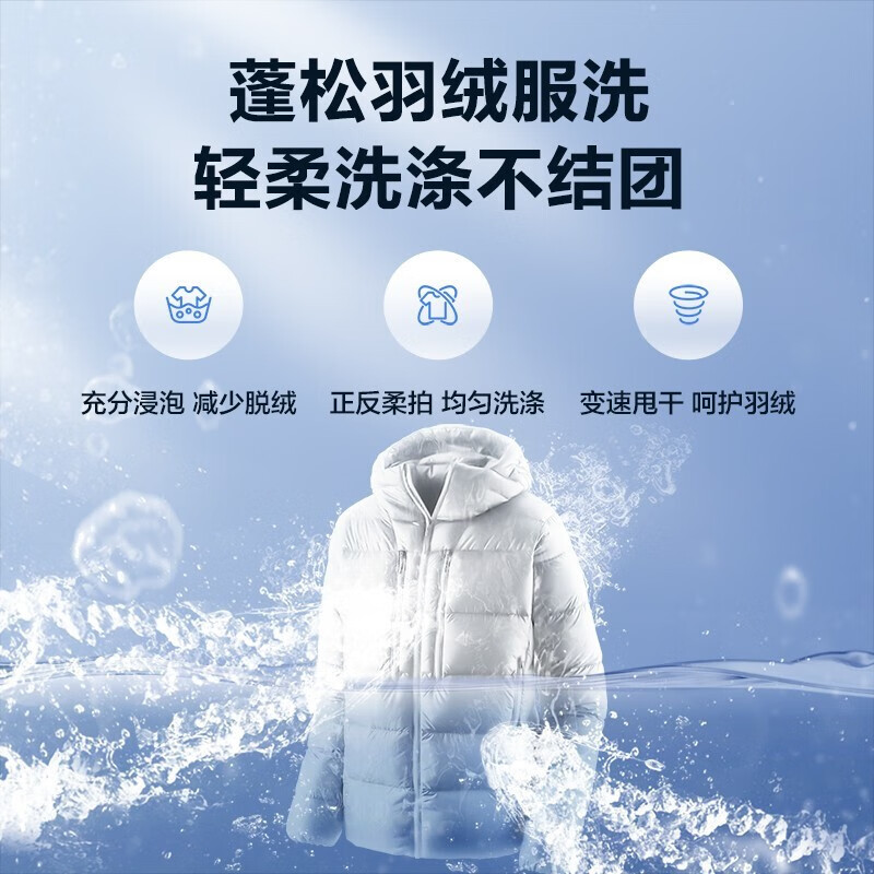 [羽绒服洗】充分的和水接触,轻柔的洗涤节拍,低转速的脱水 给您的羽绒服更呵护的洗涤方式