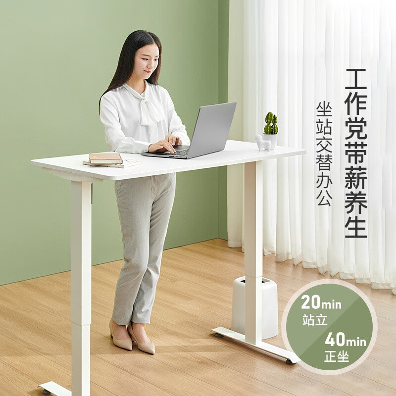 一键电动升降,无需手摇调节,想坐就坐,想站就站,为健康多想一步。坐站交替,建议坐50分钟后站立10分钟。采用德国TUV认证电机,单电机驱动,按键轻松调节高度,升降平稳无卡顿。