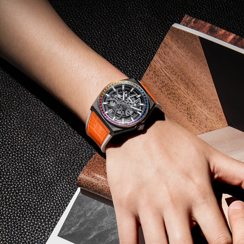 ZENITH真力时的腕表以复杂功能时计著称,多用贵金属作外壳,皮带表居多,是比较传统的腕表,自产机芯,和万国、劳力士同级。DEFY是真力时的特色系列,此款32.9003.670/86.R588 男士机械腕表,其独特之处在于缤纷宝石镶嵌而成的表圈,48颗挟长方形切割蓝宝石,散发出整个彩虹般的渐变色泽。带有星型图案的开放式表盘,营造出和谐的视觉深度。搭配鳄鱼皮表带,钛金属双折叠表扣,尽显奢华。