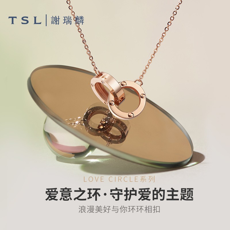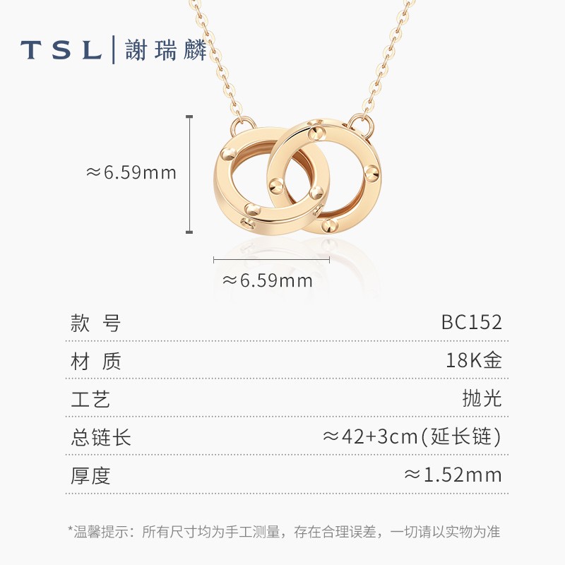 TSL 谢瑞麟 LOVE CIRCLE系列 女士18K金项链 BC152 爱意之环,守护爱的主题。采用了双环相扣简约精致,双环形似恋人携手相伴,寓意恋人白头偕老、幸福隽永的设计理念。细腻K金温柔显白,甄选18K金细致打造,温柔优雅显肤色白皙,轻松Hold住多种场合。