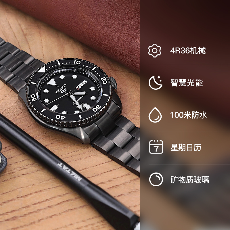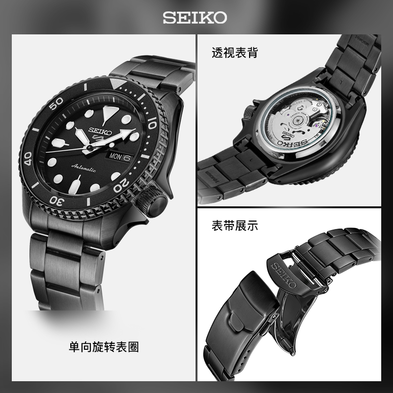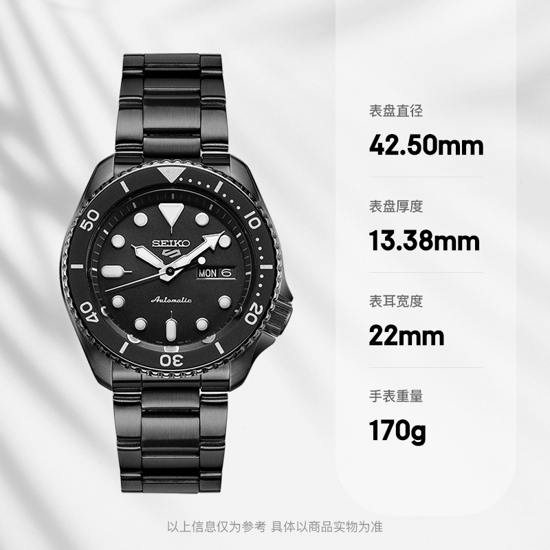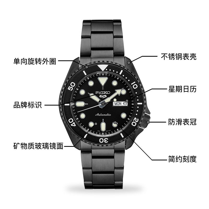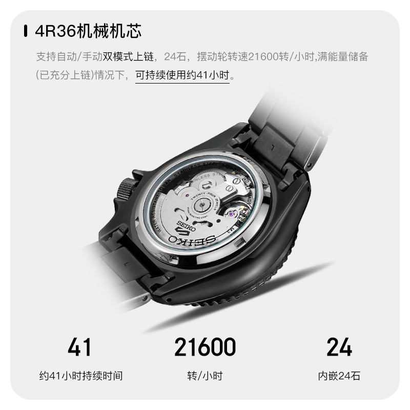 这款货号为SRPD83K1 男士自动机械手表是一款潜水腕表,采用机械机芯,不锈钢表壳,直径为42.5mm,厚度为13.38mm,表镜采用矿物玻璃,单向旋转表圈,支持100米防水。夜光指示功能可以在暗黑的水下把握时间,轻松读时。