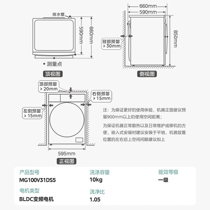 Midea美的MG100V31DS5 滚筒洗衣机,拥有10公斤洗涤容量,可满足被罩等大件的洗涤需求,搭载BLDC变频电机,脱水转速为1400转/分,达到主流水平。具有特色双温除菌洗功能,先40℃预洗,再通过60℃主洗,达到去除顽固污渍,杀灭细菌的效果。洗衣机门圈采用了抗菌材质,避免了圈垫发霉,滋生细菌,同时拥有95℃桶自洁功能,卫生状况有所保障。内置快洗、羊毛、羽绒服等多种洗涤程序,支持I-TIME智能净洗,整机尺寸为595x560x850mm。