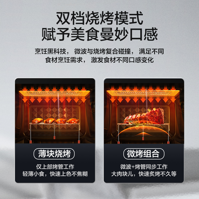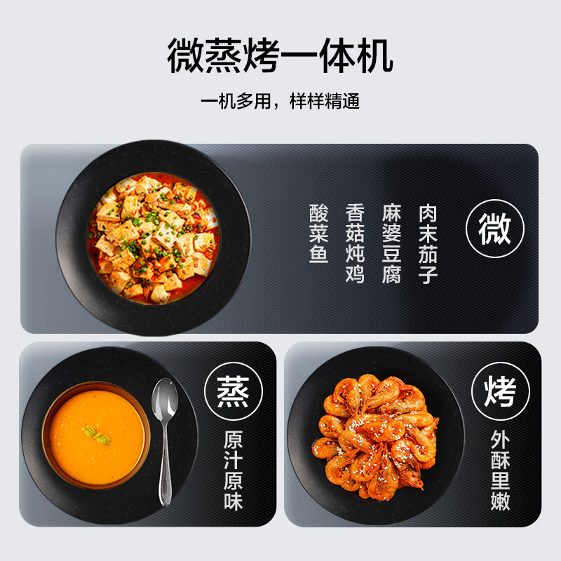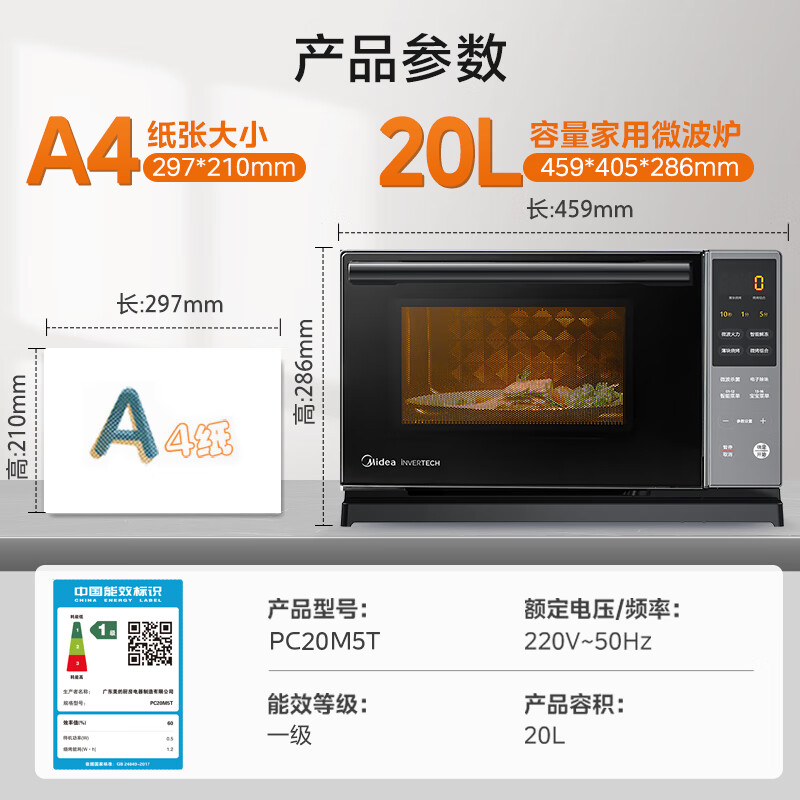 PC20M5T 20升微波蒸烤一体机,800w大功率,5档精准火力控制。一级能效标准。具有变频降噪功能。双档烧烤模式,可匹配不同食材。支持16道预设菜单。