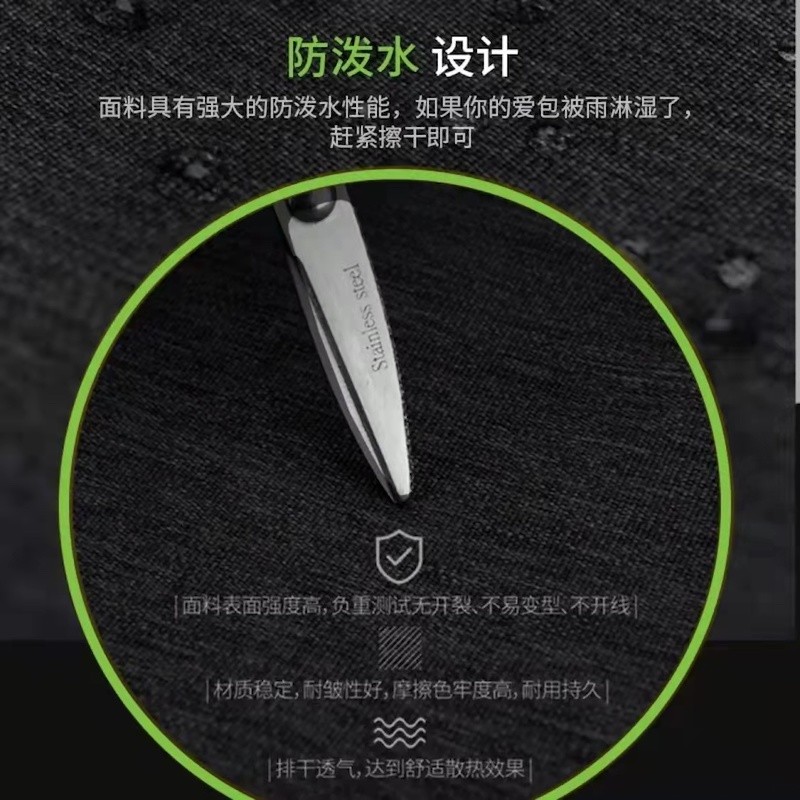 面料采用防泼水牛津布,里料采用涤纶。防泼水牛津布优选轻量化面料和配件,减轻包包自身重量,包包仅重0.43kg。