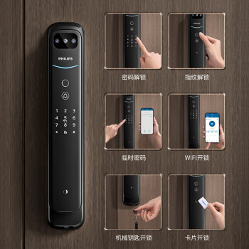 飞利浦智能门锁DDL-702-VP-5HW,IPS大屏视野,门外状况,清晰可见。4英寸高清显示,远程可视,手机双向对讲,全自动锁体,随时随地操控,指纹识别,一触快速开锁,六大开门方式,适合全家老小。室内高清大屏,来者何人提前知道,144°大广角猫眼,配合1080p高清像素,门外状况一目了然,2G大容量存储,1000条可存视频量,安全便捷。