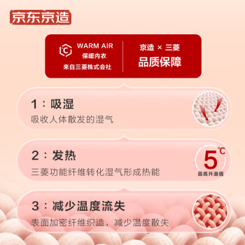 京东京造使用三菱株式会社的纱线 研发的WARM-AIR轻暖内衣,这是 一套轻薄、发热的隐形打底内衣。 它应用三菱美雅碧超细腈纶,具有 发热、轻盈暖、3A抗菌、抗静电的 特点、能恰好的满足初秋乍寒时需 要的轻保暖和透气感。