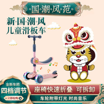 国风实力派,座椅款单车可选,儿童滑板车,玩酷实力派,一键折叠,轻松搞定,音乐灯光,全新车把,四档可调节,装甲车身,高强承重,后轮脚刹,一踩即停,安全防滑把套。