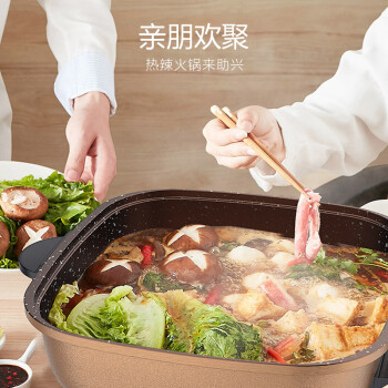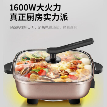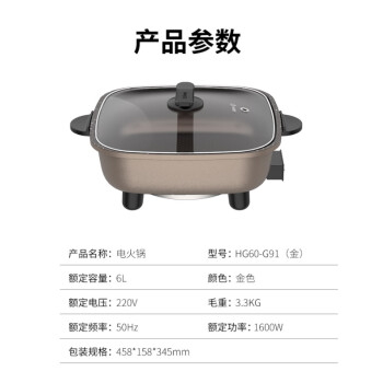 九阳此款型号为HG60-G91的电火锅,容量为6L,适合多人使用。可实现涮烤烙煎煮炒等多种功能, 采用麦饭石材质,不易粘锅,好清洗。最高功率1600W,5档火力可调,针对不同食材。使用防烫提手,可直立锅盖,散热底座,支持过热保护等。