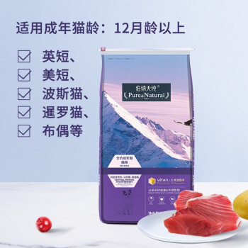 本款伯纳天纯成猫猫粮,适合多品种猫咪食用,适宜的蛋白质含量,营养均衡,有助于保持猫咪体型。配方科学,除了基本的肉类营养,还添加了蔓越莓,蔓越莓富含原花青素,能够减少尿路系统的细菌附着,保护猫咪泌尿系统健康;也特别添加了车前子,能够促进肠胃蠕动,营养好消化吸收的同时,间接促进猫咪毛球的排出。但是原料不含鲜肉成分,追求鲜肉营养的铲屎官要注意啦~