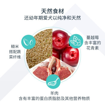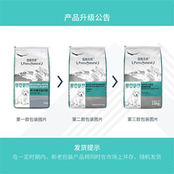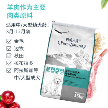Pure&Natural 伯纳天纯 营养倍护系列 全价中大型犬狗粮,针对爱犬在不同生命阶段和生活方式的营养需求,设计专属的科学营养配方。天然食材,营养加倍。鸡肉和羊肉含有丰富的蛋白质、脂肪及其他营养物质;蔓越莓含丰富的花青素及紫薯搭配蔬菜纤维。DHA&EPA,是一种对狗狗非常重要的物质,它在大脑和视网膜中有丰富含量。主粮中含有Omega38&6可以提供狗狗毛发生长所需的营养。科学配比、富含钙质,满足狗狗成长过程中的钙质需求。