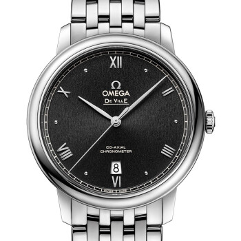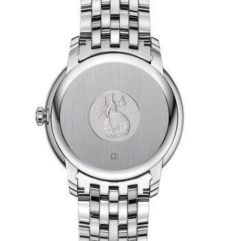 39.5毫米壳配备精钢表圈和耐磨损蓝宝石玻璃表镜,搭配精钢典雅表链。腕表内部搭载欧米茄2500同轴机芯。