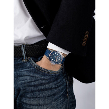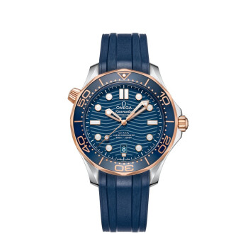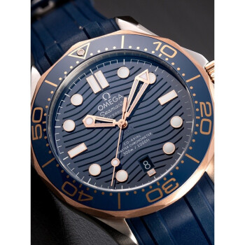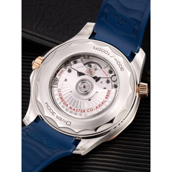 欧米茄 210.22.42.20.03.002 男士机械表,外壳采用精钢与Sedna 18K金打造而成,单向旋转表圈。蓝色陶瓷表盘,镌刻波纹图案,6点钟位置设有日历窗口。搭载欧米茄8800至臻天文台机芯,背透设计,机芯运转美态清晰可见。搭配蓝色橡胶表带,动力储存55小时,300米防水。