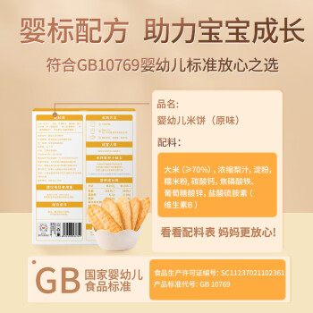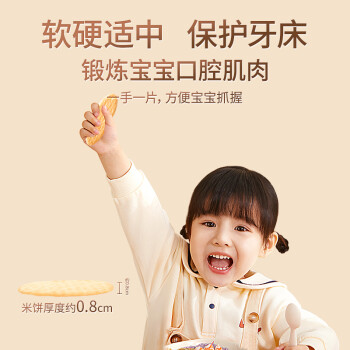 此款婴儿米饼无添加盐糖和添加剂,婴儿专用,钙铁锌,易溶不卡喉。精选东北稻花香大米,浓香自然米香、宽扁设计、宝宝小手更好掌握、无盐配方、妈咪更放心。
