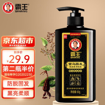 霸王(BAWANG)推出的这款洗发液,内含首乌、侧柏叶、黑芝麻、桐叶等成分,改善脱发现象,修护受损伤发质,为秀发补充所需营养物质,调理和滋润头皮,强化发根,令头发乌黑浓密、顺滑亮泽。产品质地轻润,泡沫绵密,并带有草本清香。适用于枯黄、易掉发质。