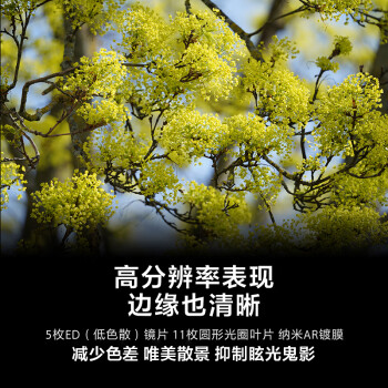 采用 17 组 24 片光学结构,包含 1 片非球,5 片 ED,可较大限度地减少色差,镜组由 DDSSM 超声波马达驱动,能快速、精准、安静并且持续锁定追踪移动的物体。11 枚圆形光圈叶片,可营造柔顺的散景效果。镜头采用纳米 AR 镀膜,减少逆光拍摄时产生的眩光和鬼影。此外,镜头前后端镜片上还具备氟镀膜涂层,在户外使用环境下能很大程度上减少镜头表面沾染灰尘和指纹。