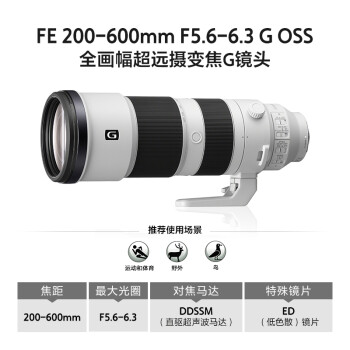 索尼 SEL200600G 发布于 2019 年,是第一支原生 E 卡口 600mm 超远摄变焦镜头。整体重量 2115g,采用内变焦,不会因为变焦而改变重心,导致端不稳而丢失构图。配备三种光学防抖模式,利于抓拍及成片率的提升。