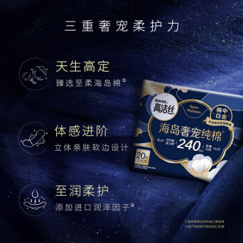 Kotex 高洁丝是Kimberly-Clark金佰利集团旗下的女性卫生用品品牌,产品包括纯棉卫生巾、超薄卫生巾、日用卫生巾、夜用卫生巾、迷你卫生巾、夜安裤、护垫等女性卫生巾产品。这款臻选系列卫生巾,采用澳洲进口棉花,0.08mm的吸收芯,吸收快无不适感,不含可迁移性荧光增白剂,不含重金属,使用更安心。