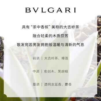 宝格丽(BVLGARI)推出的这款大吉岭茶男士淡香水,半透明方形瓶身精致简约,线条轮廓利落醒目,整体富有质感。香水为木质馥奇香调,大吉岭茶的清新与黑胡椒的辛香中带着麝香的温暖,简单而纯粹。 前调:大吉岭茶叶 睡莲 中调:愈创木 黑胡椒 后调:透明龙涎香 麝香