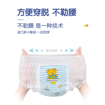泰迪熊纸尿裤品牌由德国著名的婴童消费品公司Teddybär international GmbH授权,2009年开始进入中国市场,旗下有呼吸特薄系列、臻薄宠爱系列、亲肤肌贵系列等系列纸尿裤。泰迪熊甄选全球知名材料供应商,确保所有产品的原材料安全,如:德国巴斯夫、德国汉高、美国3M材质供应商,都是泰迪熊的原材料合作伙伴。本款臻薄宠爱系列拉拉裤薄约2mm,数万个微透气孔,透气不闷热。日本住友进口高分子,多边形快速吸收,防止渗漏。进口橡胶弹力腰围,舒适不勒腰,一拉即穿,穿脱非常方便,让宝宝随心而动,自由探索周边世界。