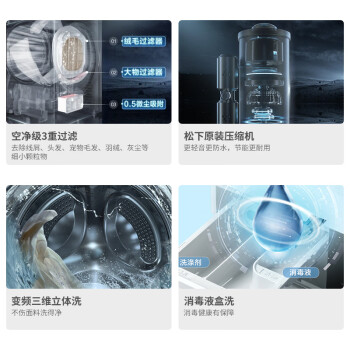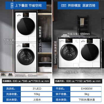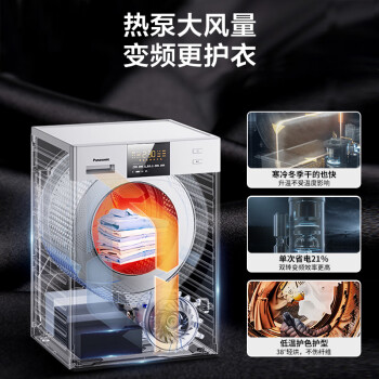 松下这款型号为NH-EH900W的烘干机为21年新品,烘干容量9kg,采用双转子变频压缩机,热泵式烘干方式,相较于冷凝式烘干机,具有更高的烘干效率,同时节能降噪优势明显;搭载高精度温湿度计衣物探测器,结合AI算法,可以智能匹配烘干时长,衣干即停不伤衣;5档干衣度可调,满足即穿烘干、日常烘干、熨烫烘干、晾晒烘干、换季储藏等不同干衣需求;支持三重过滤烘干,有效过滤绒毛、碎屑、粉尘等;外形尺寸为宽596*深630*高845mm。