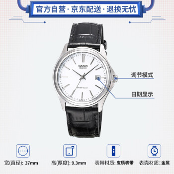 CASIO 卡西欧的手表向来以设计时尚、功能丰富且价格亲民的姿态示人。这款大众指针系列 MTP-V006L-7B 男士时装腕表,搭载日本石英机芯,走时稳定。白色盘面,银色大三针,条形时标,3点钟位置有日期显示窗,表盘边缘以阿拉伯数字标记分钟。精钢不锈钢表壳直径约38毫米,厚约9毫米。矿物强化玻璃表镜,透光率高。皮质表带,细腻儒雅。生活防水。