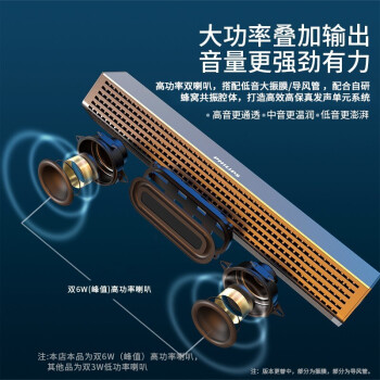 澎湃低音,立体环绕。高功率叠加喇叭+低音大振模,导风管增强声音立体感,营造如临现场的音场感。专业设计,仰角发音。180°仰角有效扩大发音面,令音质更加干净宏亮,清晰动听。定制芯片,功率翻倍。市面上长条音响功率普遍为6瓦,飞利浦定制超频芯片可放大音效增益达12瓦。飞利浦防干扰技术,减少内外环境干扰,避免显示器色彩失真有效的克服电流杂音不再担心电脑/手机带来的干扰,为清晰音质保驾护航。12W大功率(峰值)输出,双6w大功率喇叭叠加设计,确保满音量不破音不失真。
