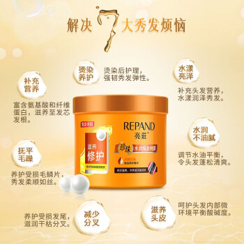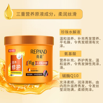 亮荘(Répand)推出的这款发膜,有滋养修护型和丝质顺滑型两种类型,均添加珍珠水解液、氨基酸、辅酶Q10等成分。滋养修护型发膜可帮助滋养和修护受损发丝,为秀发补充营养,令秀发弹性亮泽。丝质顺滑型发膜可改善头发干枯、暗哑、分叉、脆弱、毛躁、打结等问题,令发丝柔亮顺滑易梳理。可根据发质需求选择使用。
