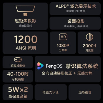 采用低能耗ALPD激光光源,设计亮度为1200ANSI流明,且符合Rec.709色域范围,更好的还原画面本来的色彩,所见即所得。内置FengOS大屏影音娱乐系统,用户可根据自己喜好收藏片源节目。同时配置一对8瓦大腔体音箱,将家庭影院影、音合一,一机输出。