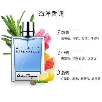 菲拉格慕(Salvatore Ferragamo)推出的这款蔚蓝之水男士淡香水,采用透明玻璃瓶身搭配黑色品牌LOGO,整体简约时尚且富有质感。香水为馥奇香调,自然气息与辛香交织,最后融入温和麝香,沁人心脾。 前调:薄荷 苦橙叶 中调:老鹳草 迷迭香 薰衣草 海水 后调:广藿香 香根草 麝香 劳丹脂