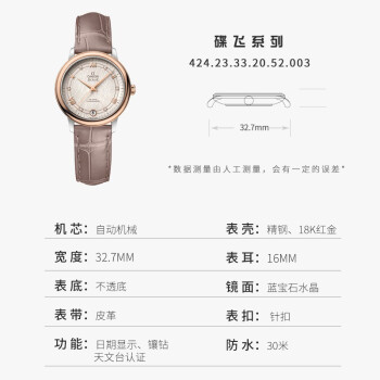 OMEGA 欧米茄 碟飞系列 女士自动机械手表 424.23.33.20.52.003,表壳精钢材质、18K红金,表耳16MM,镜面为蓝宝石水晶镜面,基础机芯ETA 2892-2,振频28800每小时振荡次数,瑞士天文台认证。