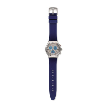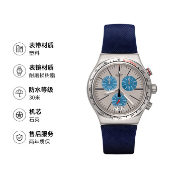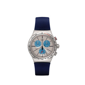swatch 斯沃琪 男士石英表 YVS435,该产品设计中采用浅灰色表盘搭配彩色机芯,六点钟方向日历窗,时尚搭配各类单品。30米生活防水,有机玻璃表镜,韧性好不易碎,读时清晰。线条清晰的雾面深蓝色橡胶表带线条结构明显佩戴舒适,美观大方。