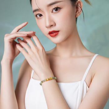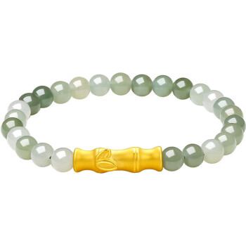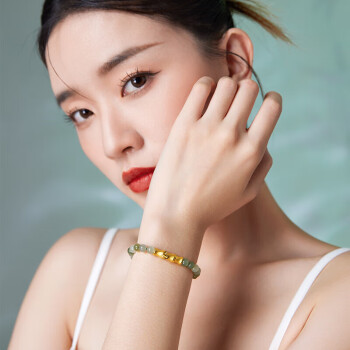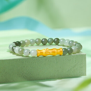 ZHOU LIU FU 周六福 黄金和田玉手串 Y1910857,和田玉色泽透亮,大小均匀、饱满圆润,搭配细腻质感的足金串饰,佩于腕间,更显雅韵悠长。选用桃花、竹子、福牌等元素,打造生动形象,精巧闪耀的串饰,立体饱满。