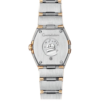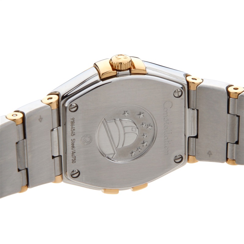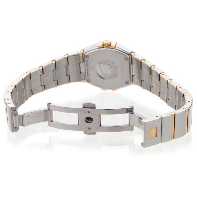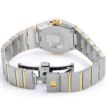 来自欧米茄星座系列的女士腕表,该表为石英表。表带为金属材质。表盘有白色贝母等材质,上面饰有12枚钻石小时刻度。圆弧形耐磨损蓝宝石水晶镜面,內部经防反光处理。表壳、表冠及表带为精钢搭配18K黄金或18K红金为主。