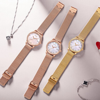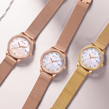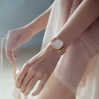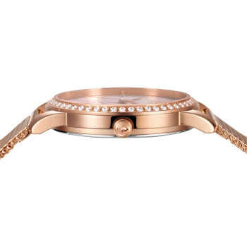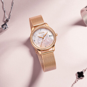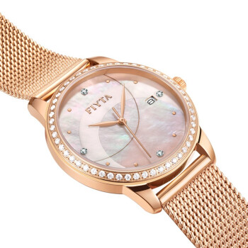 FIYTA飞亚达是国内知名手表品牌,这款Fancy系列 DL865001.PWPD 女士时装腕表,搭载石英机芯,镀玫瑰金色表壳及网状表链,同材质表圈上镶嵌有密密麻麻的水钻,玫瑰金大三针,4颗水钻时标,3点钟位置有日期显示窗,表壳直径约34毫米,厚约7.2毫米,30米生活防水。