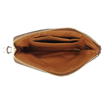 此款女士手拿包,采用荔枝纹皮革材质,表面大面积Logo印花修饰,经典耐看,撞色拼接设计,上面设有品牌标志点缀,双层拉链设计容量更大,款式简约大气,比较小巧,商品尺寸为:155*100*20mm,适合手拿,便携实用。
