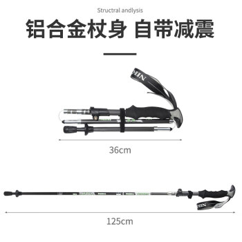 铝合金杖身自带减震,重量轻,多轴向差错卷制方式,令其韧度更高,登山杖结构解析,科学合理结构,助力户外登山攀岩,为你提供安全防护,安全锁紧系统多重防护,三重防护,提升稳定性和安全性。